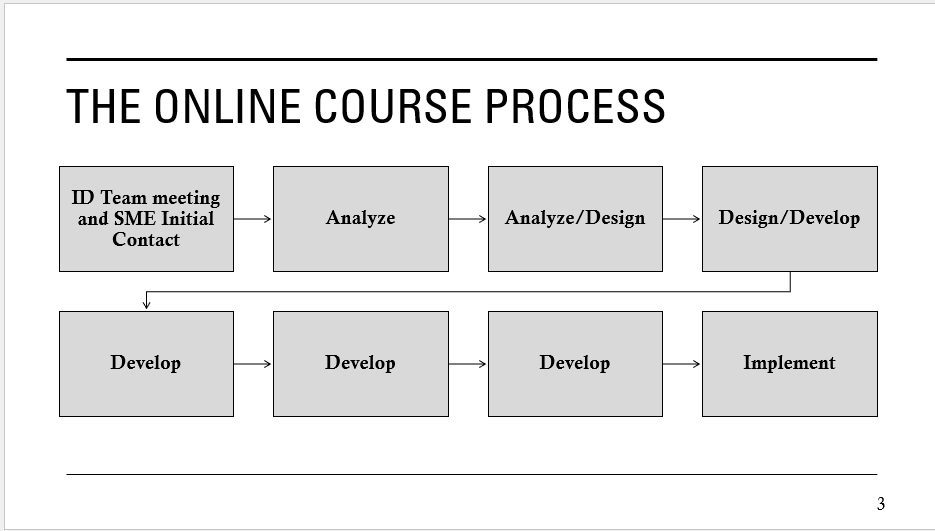 To answer the question, “What is my experience with online courses?” I want to highlight my course development process, and showcase an eLearning artifact that is available online. Because the development materials for the online courses have interdepartmental feedback that I cannot share, I intend to discuss how I manage my instructional design and eLearning responsibilities.